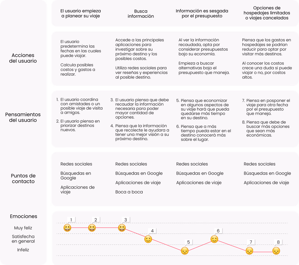 En las entrevistas con los viajeros, identificamos diferentes puntos de vista sobre cómo planifican y desarrollan sus viajes. Descubrimos que, en la mayoría de los casos, la información que recopilan proviene de las redes sociales y aplicaciones que utilizan a diario.
