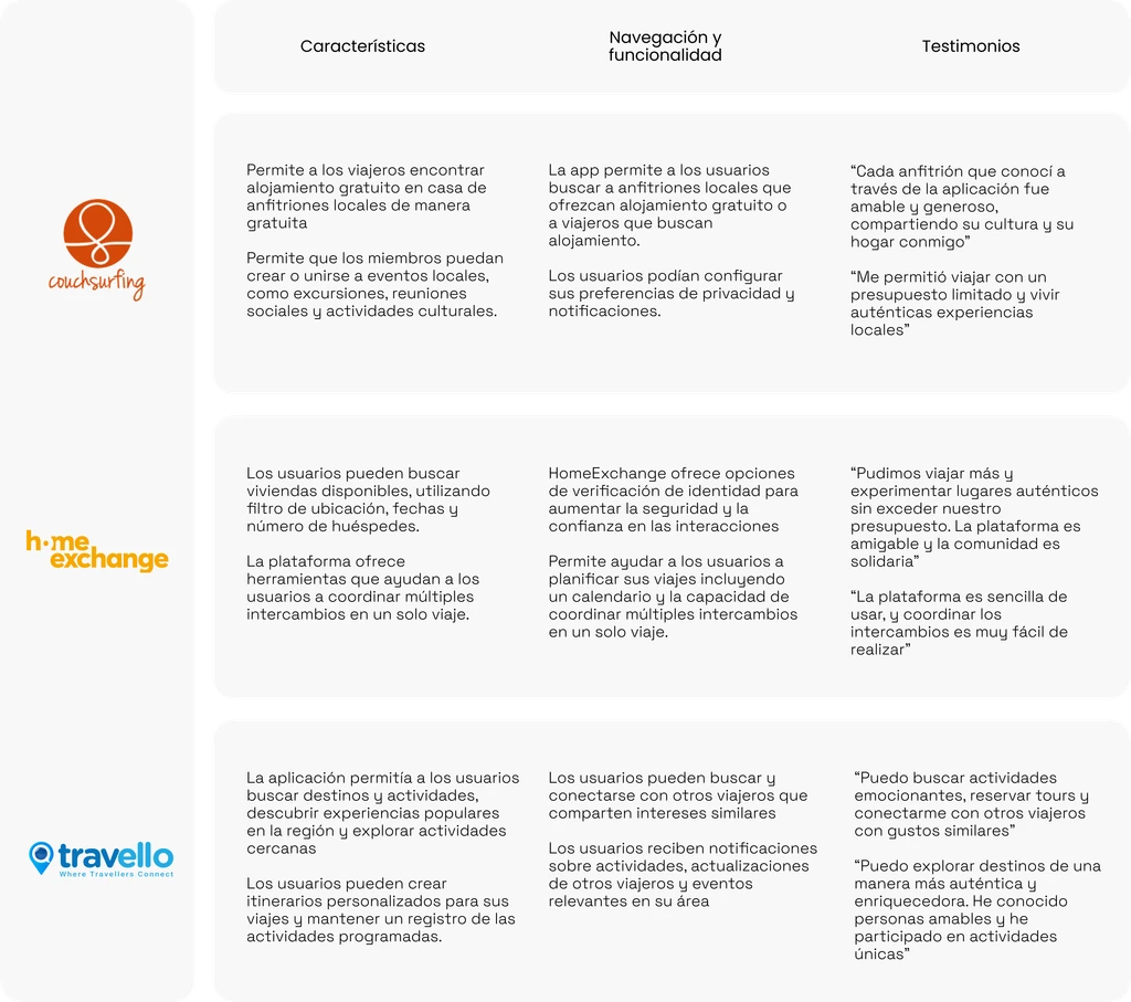 Se realizó también una investigación de marcas internacionales que representan la competencia indirecta de nuestra aplicación. Nos permitió evaluar las mejores prácticas, innovaciones y estrategias utilizadas por estas marcas, con un enfoque especial en funcionalidades, que promueven viajes económicos y asequibles.